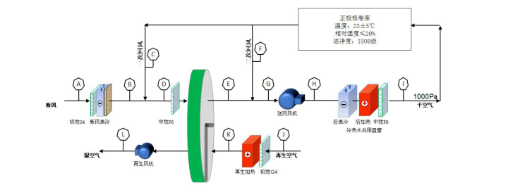 2)低濕需求空調(diào)房間,如正極輥壓間、正極分條間、正極模切間以及正極二分間等房間,其濕度控制需求為≤20%,以及正極涂布間、負(fù)極輥壓間、負(fù)極分條間、負(fù)極模切間以及負(fù)極二分間等房間,其濕度控制需求為≤45%,該需求通過冷卻除濕很難實(shí)現(xiàn),因此往往通過轉(zhuǎn)輪除濕機(jī)組處理后來滿足使用需求,機(jī)組中設(shè)置一級轉(zhuǎn)輪。