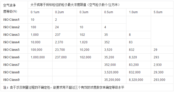 空氣潔凈度等級(jí)(air cleanliness class):潔凈空間單位體積空氣中,以大于或等于被考慮粒徑的粒子最大濃度限值進(jìn)行劃分的等級(jí)標(biāo)準(zhǔn)。