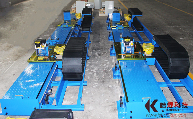 (3)、將行走單元移動(dòng)至導(dǎo)軌的中間位置,先將行走單元兩側(cè)的八個(gè)墊板上的頂起螺栓頂住墊塊,但不繼續(xù)加力,將兩個(gè)水平儀置于行走單元的平面上,一個(gè)縱向、一個(gè)橫向,觀察縱向和橫向的水平情況,選擇四個(gè)方向中*高點(diǎn)為基準(zhǔn),從*低點(diǎn)開始調(diào)平,再利用其它幾點(diǎn)微調(diào),具體方法就是利用頂起螺栓頂起低點(diǎn),至每米水平誤差0.2mm之內(nèi),中間位置調(diào)平后,移動(dòng)行走單元,至幾個(gè)不同的位置,依次進(jìn)行調(diào)平,直至各位置水平符合要求,然后擰緊拉緊螺栓,用鎖緊螺母鎖緊頂起螺栓;
